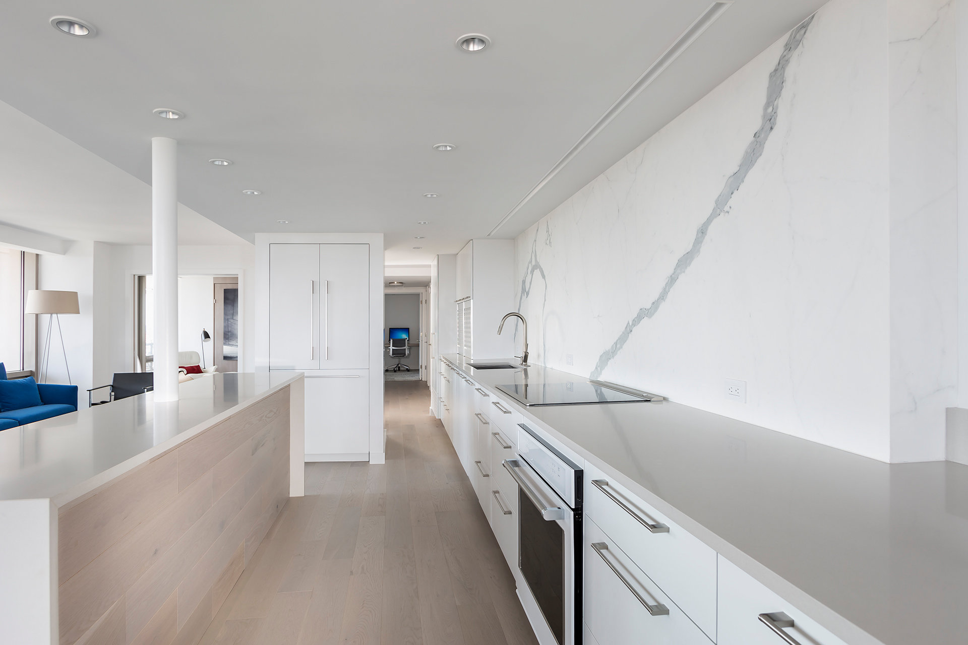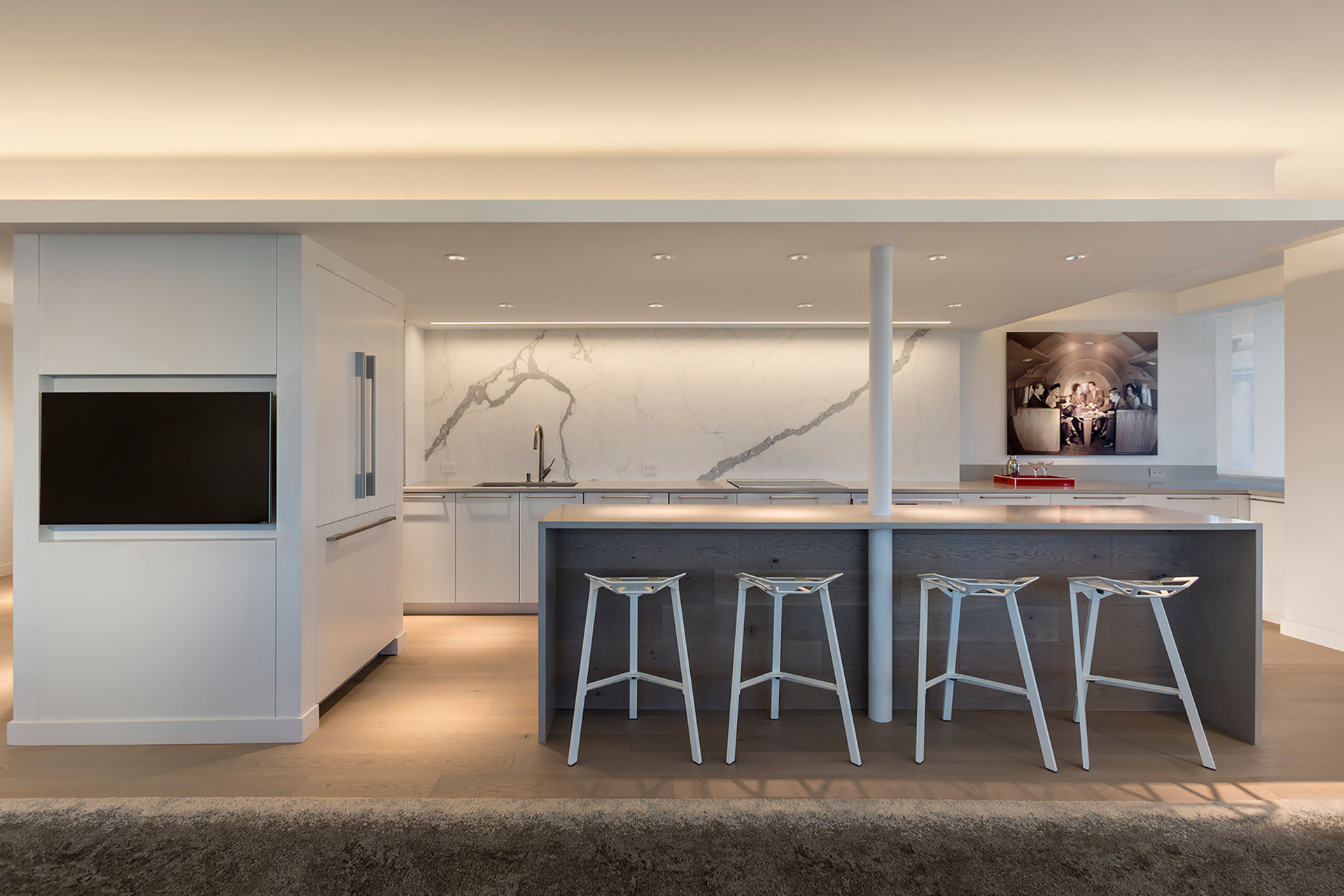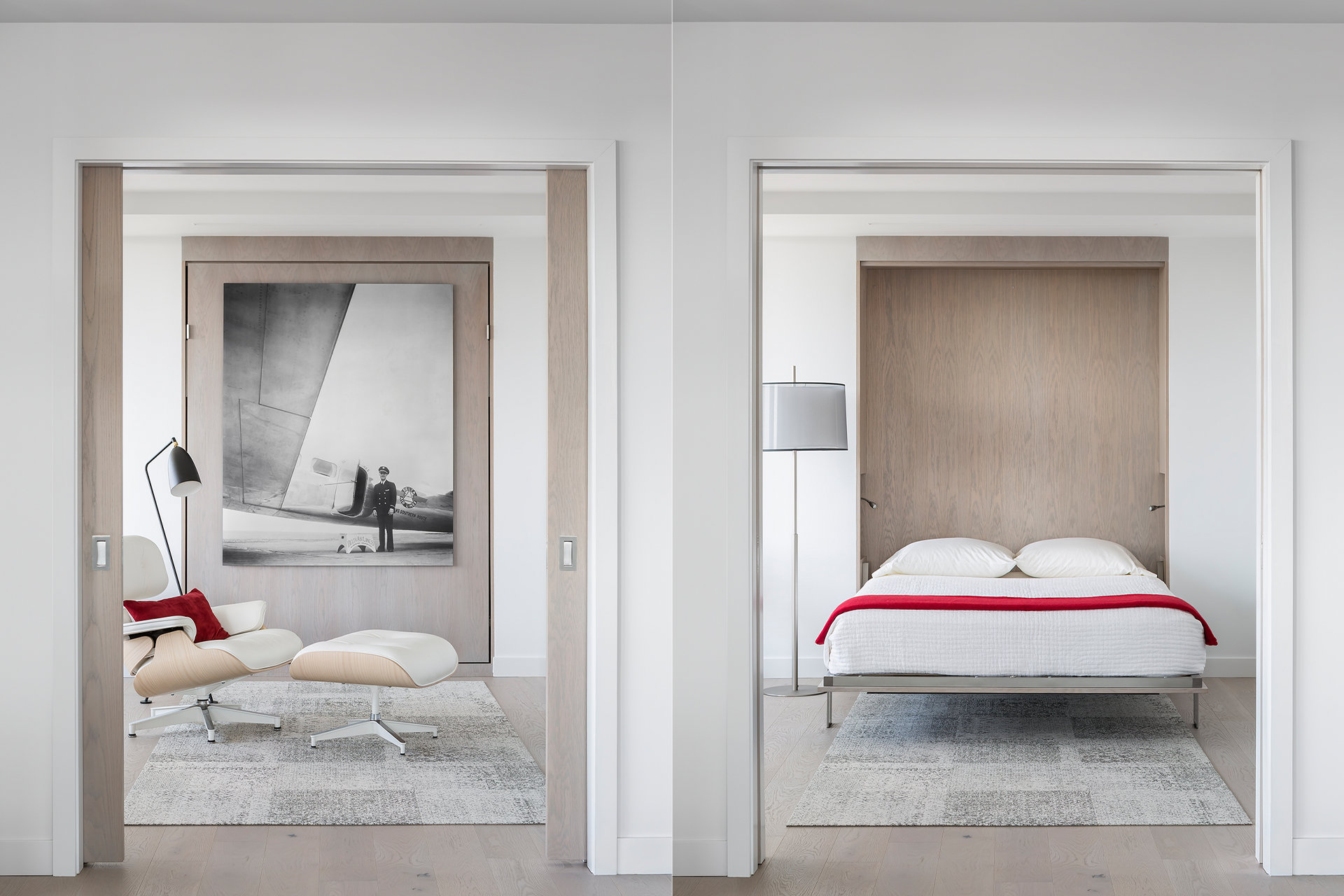 To maximize ceiling heights, recessed lighting was limited to key areas in kitchen, entry, and bathrooms. Utilities were confined to these lower ceiling areas, while sprinkler lines and heads were incorporated into a perimeter soffit that also provided a pocket for roller shades. The intent was to capitalize on natural light from floor to ceiling windows on two sides by opening up the plan. A custom murphy bed and double pocket doors allow living space to expand into the second bedroom for corporate events.
