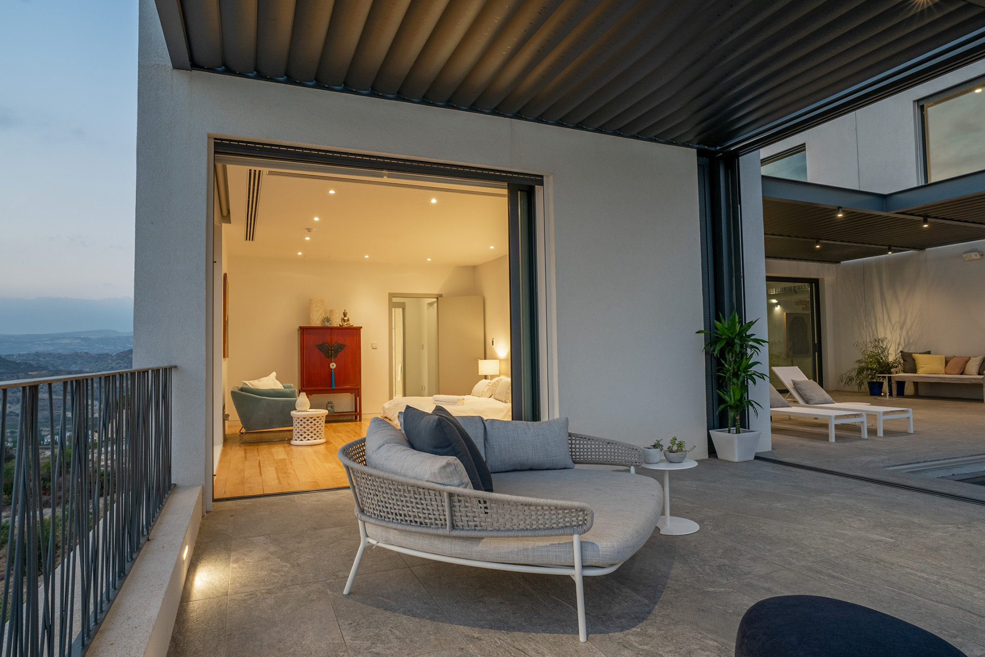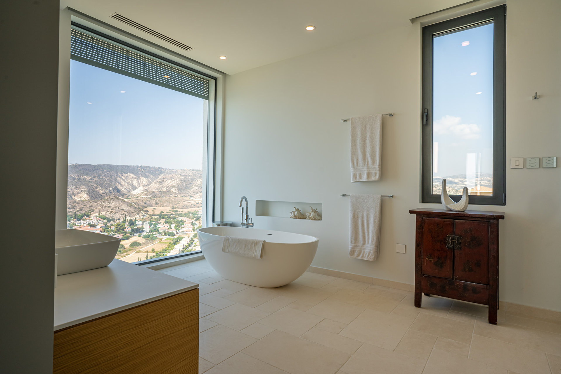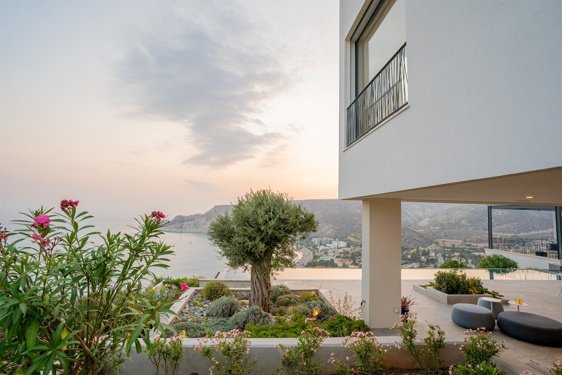 This home was designed as a retreat for a couple, their children and extended family that have roots on Cyprus. The house sits on a tall hilltop overlooking the Mediterranean Sea and the Bay of Limasol.