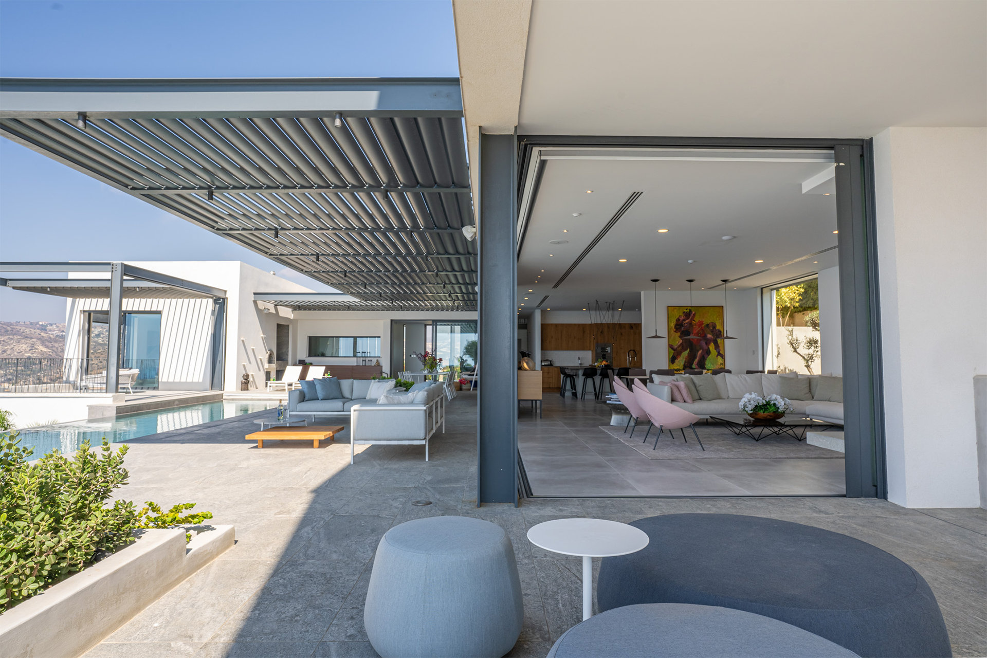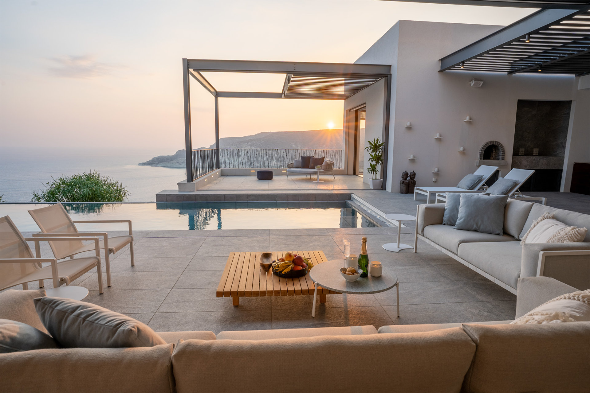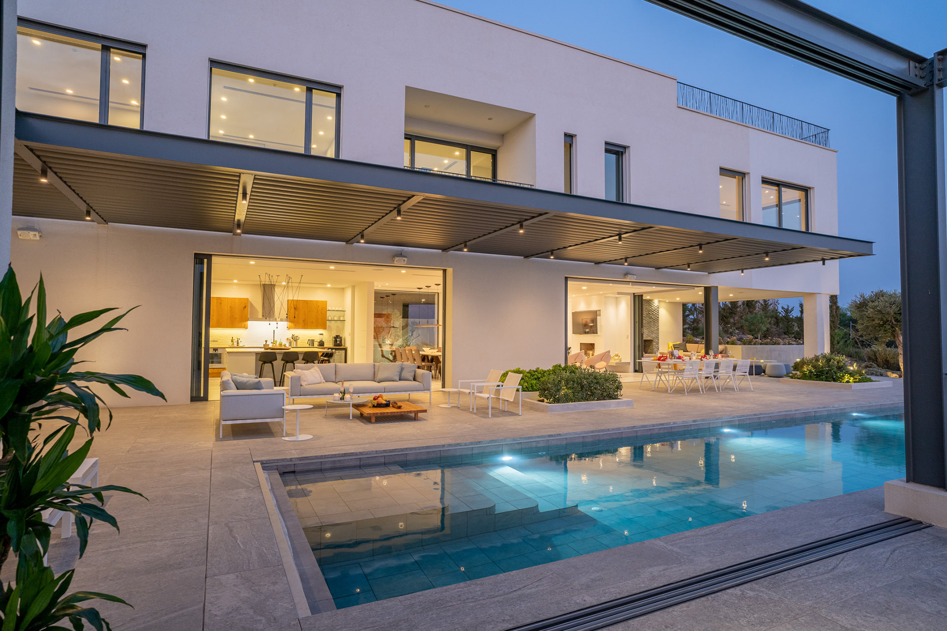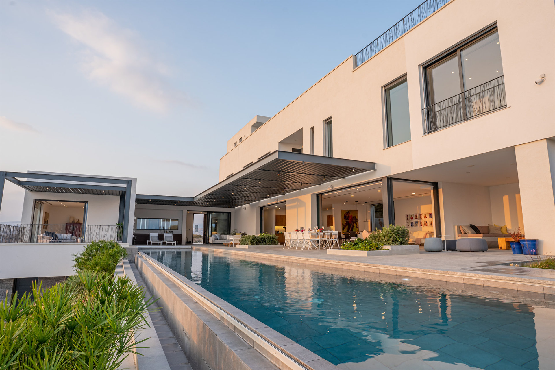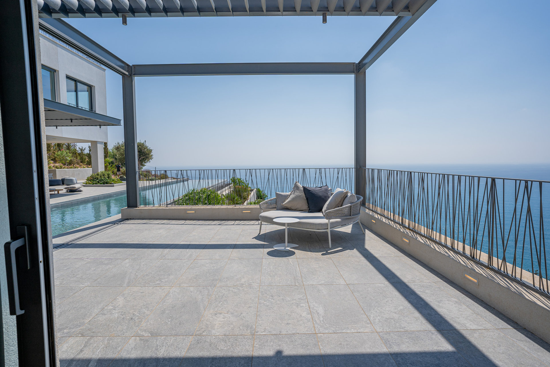 Designed with the natural topography, the two wings of the house partially enclose a large terrace for entertaining bordered by a long edgeless swimming pool that extends out to the horizon beyond. Architect of Record – Chistos Shiamaris