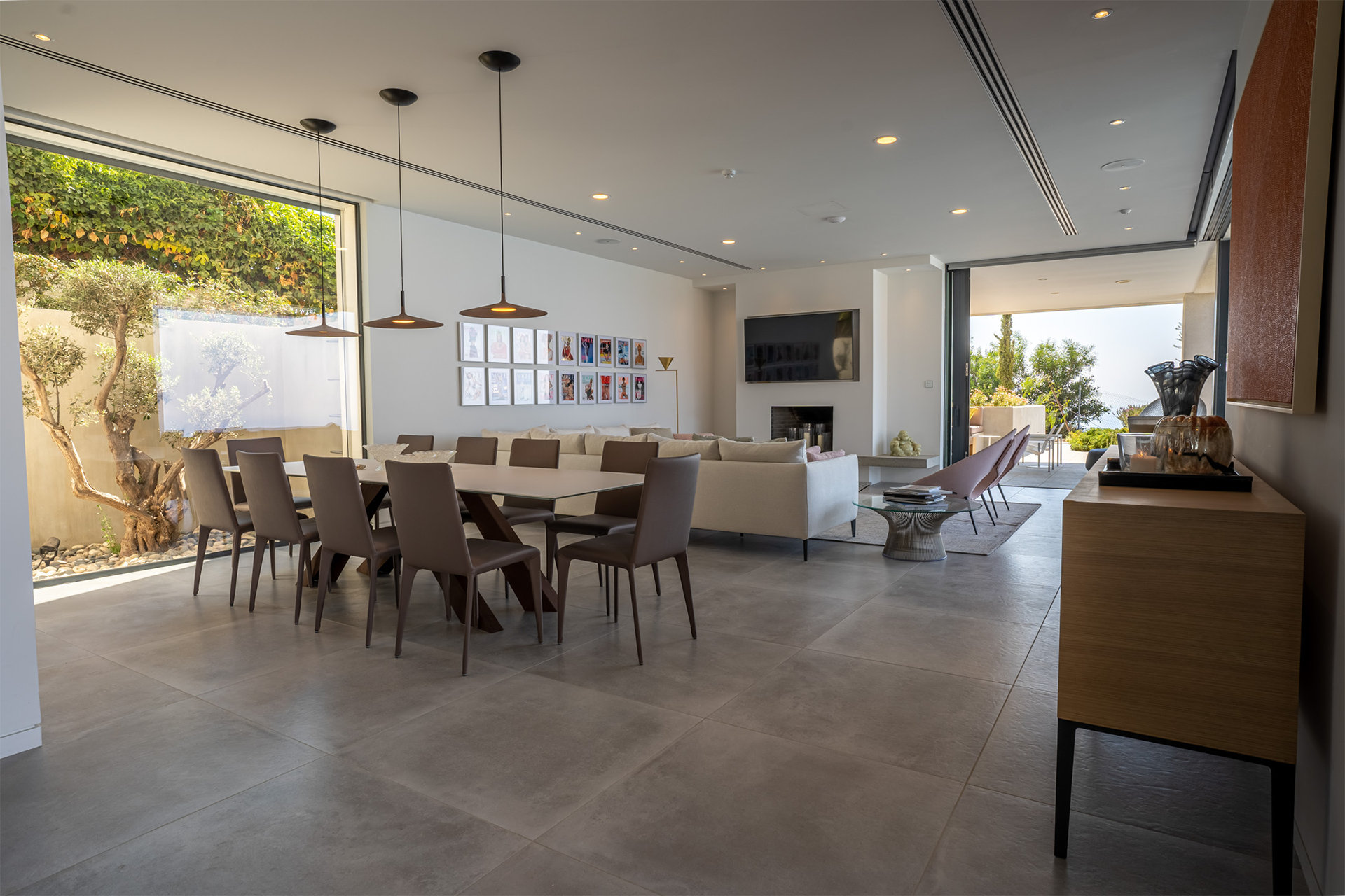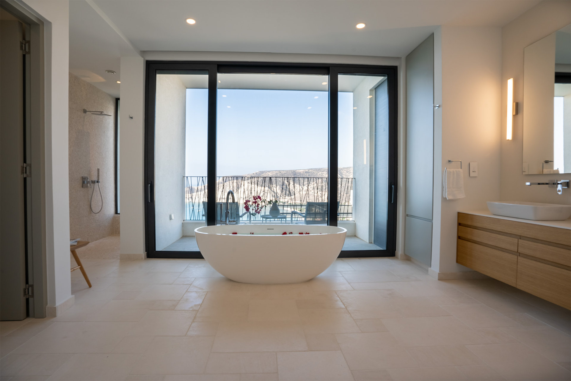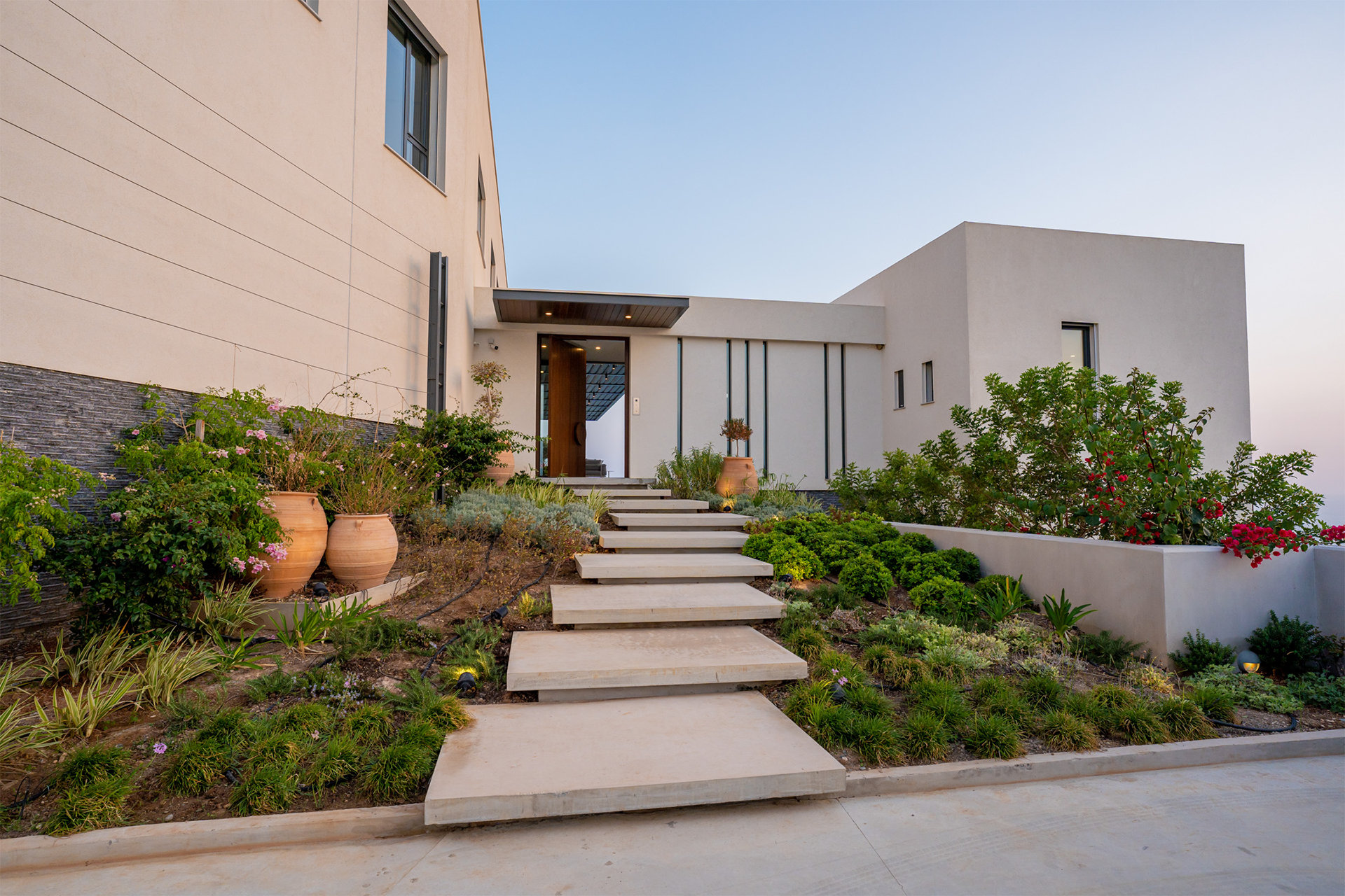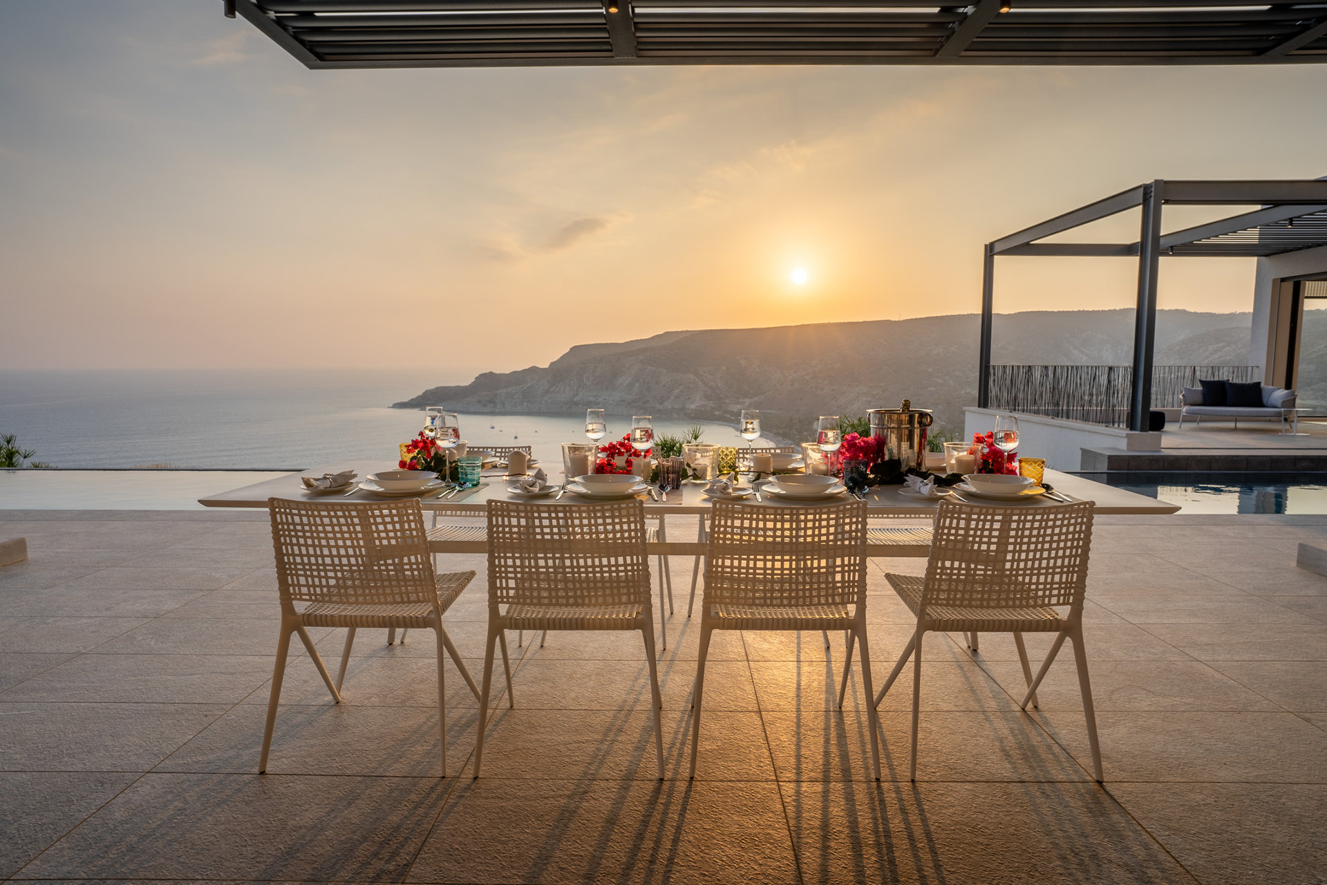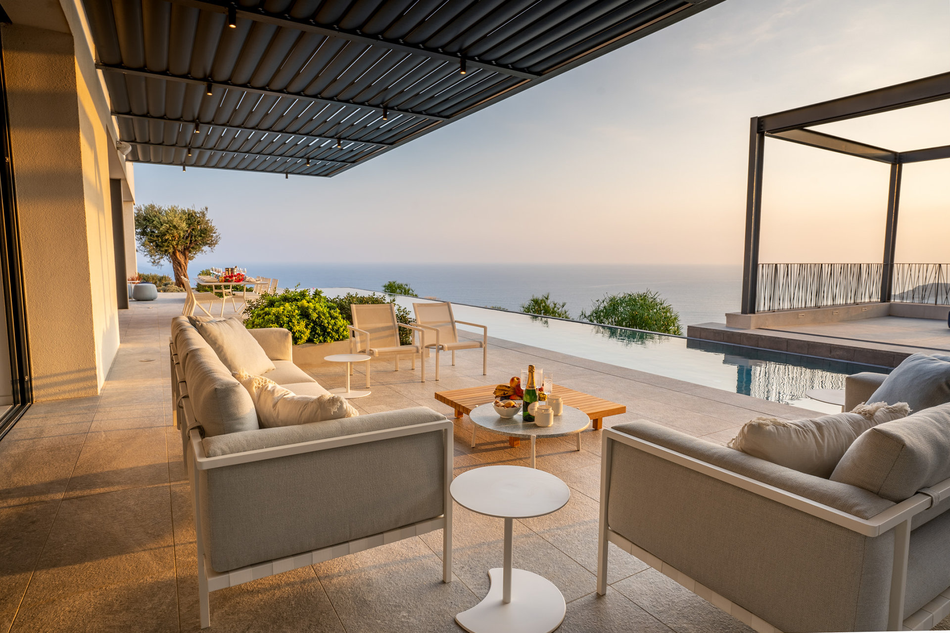 Designed with the natural topography, the two wings of the house partially enclose a large terrace for entertaining bordered by a long edgeless swimming pool that extends out to the horizon beyond. Architect of Record – Chistos Shiamaris