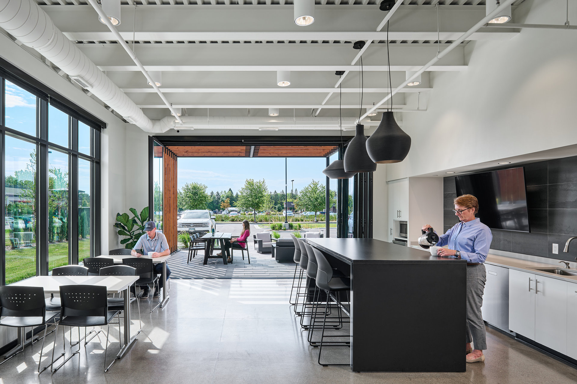 We designed an optimal office plan for their business program that includes private offices for all employees, 3 conference rooms, and a rec room with amenities including a kitchenette, arcade games and a golf simulator. The welcoming entry provides a modern and inviting atmosphere for visiting clients and guests boasting a 2-sided fireplace with comfortable seating indoors and out and warm wood accents paired with the modern exposed structure. The Rec room, which often hosts client appreciation events and is also set up as an employee amenity space, has the ability to be completely open to the outdoors from spring to fall to enjoy the outdoor fireplace, picnic area and outdoor lounge.