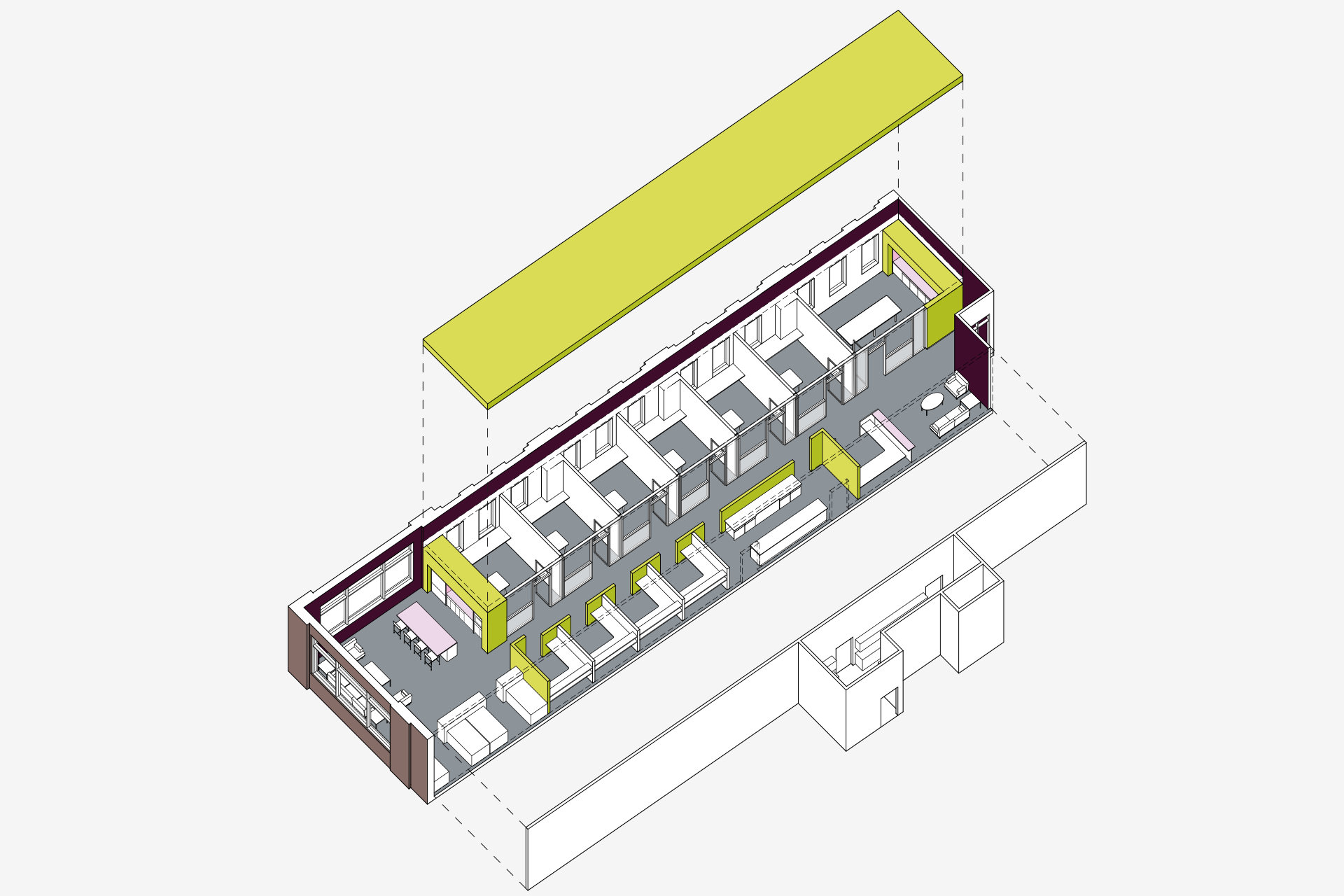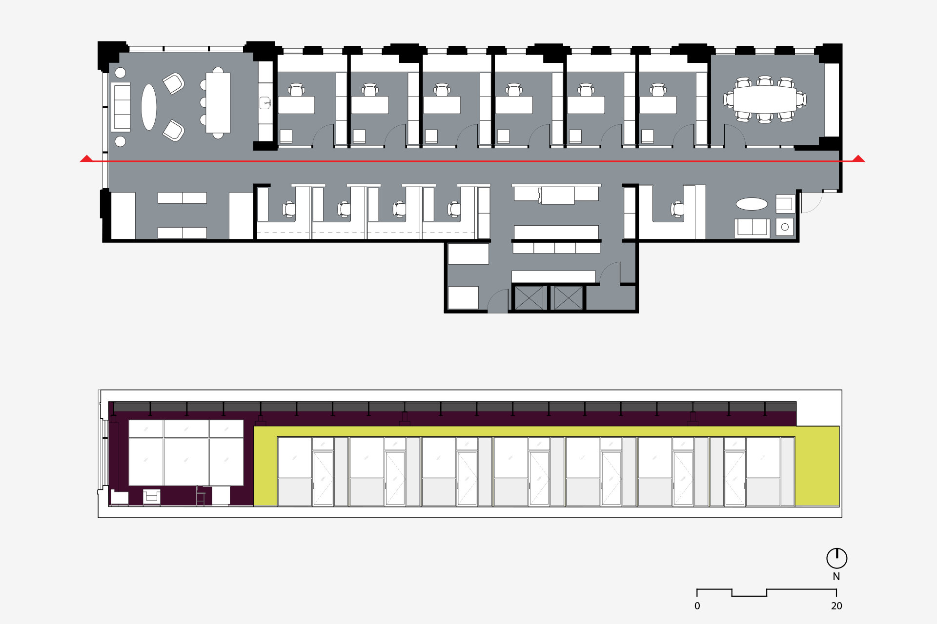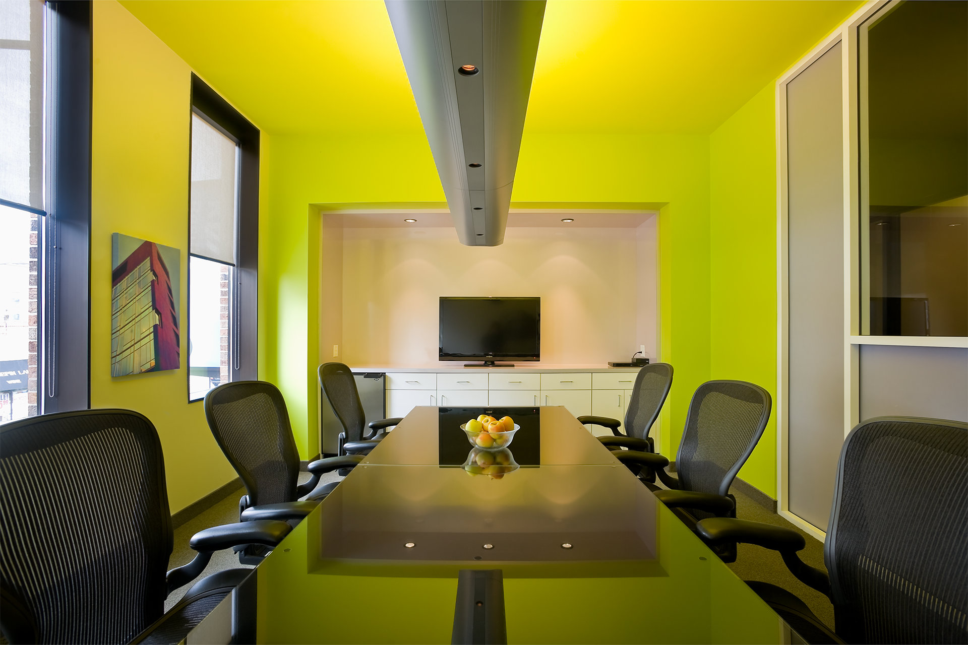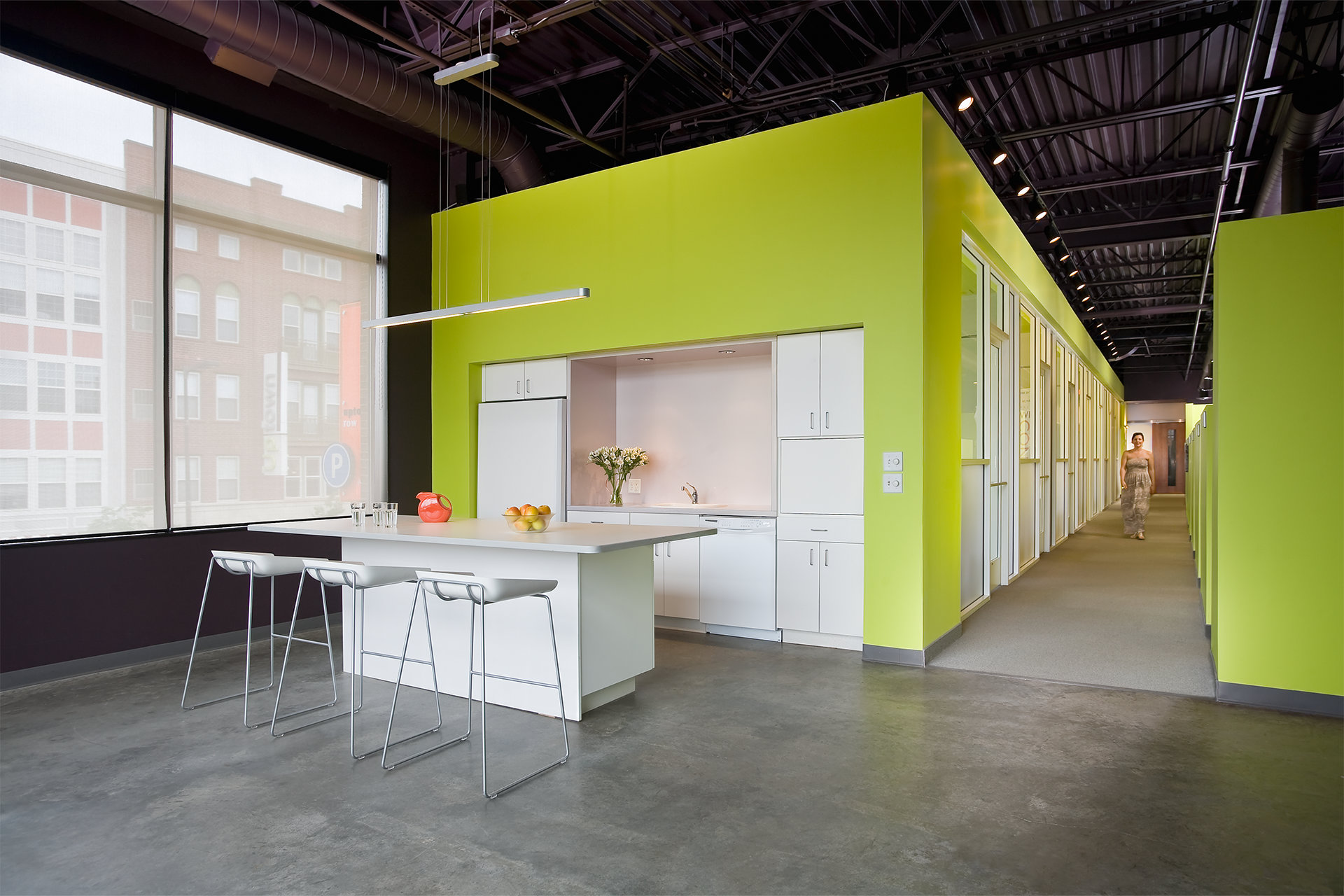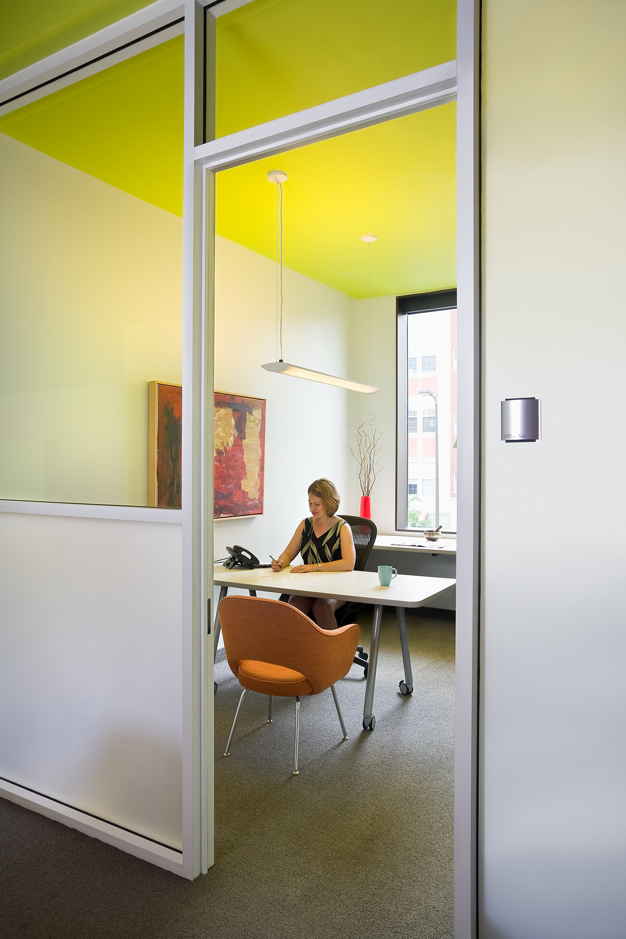 Limited in both budget and construction timeline, U+B embraced a bright color palette and natural light to create a dynamic new space for this realty group. A series of transparent and translucent panes allow sunlight to penetrate from the exterior wall through and into the interior corridor while maintaining acoustical privacy for the individual broker offices. This project was honored with an “Outstanding Office Image Award,” by the offices of this international real estate company.