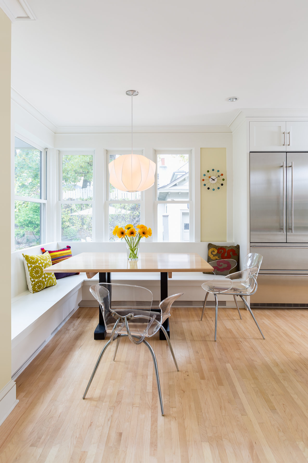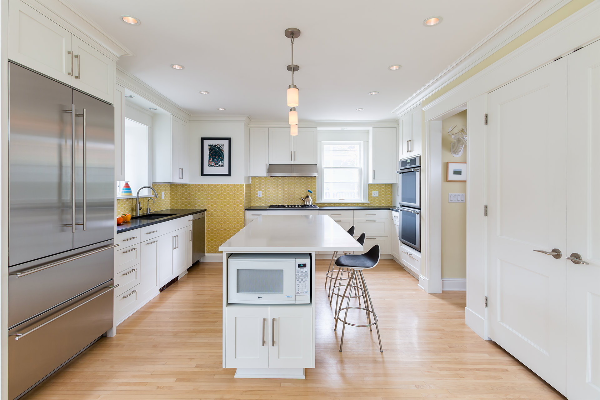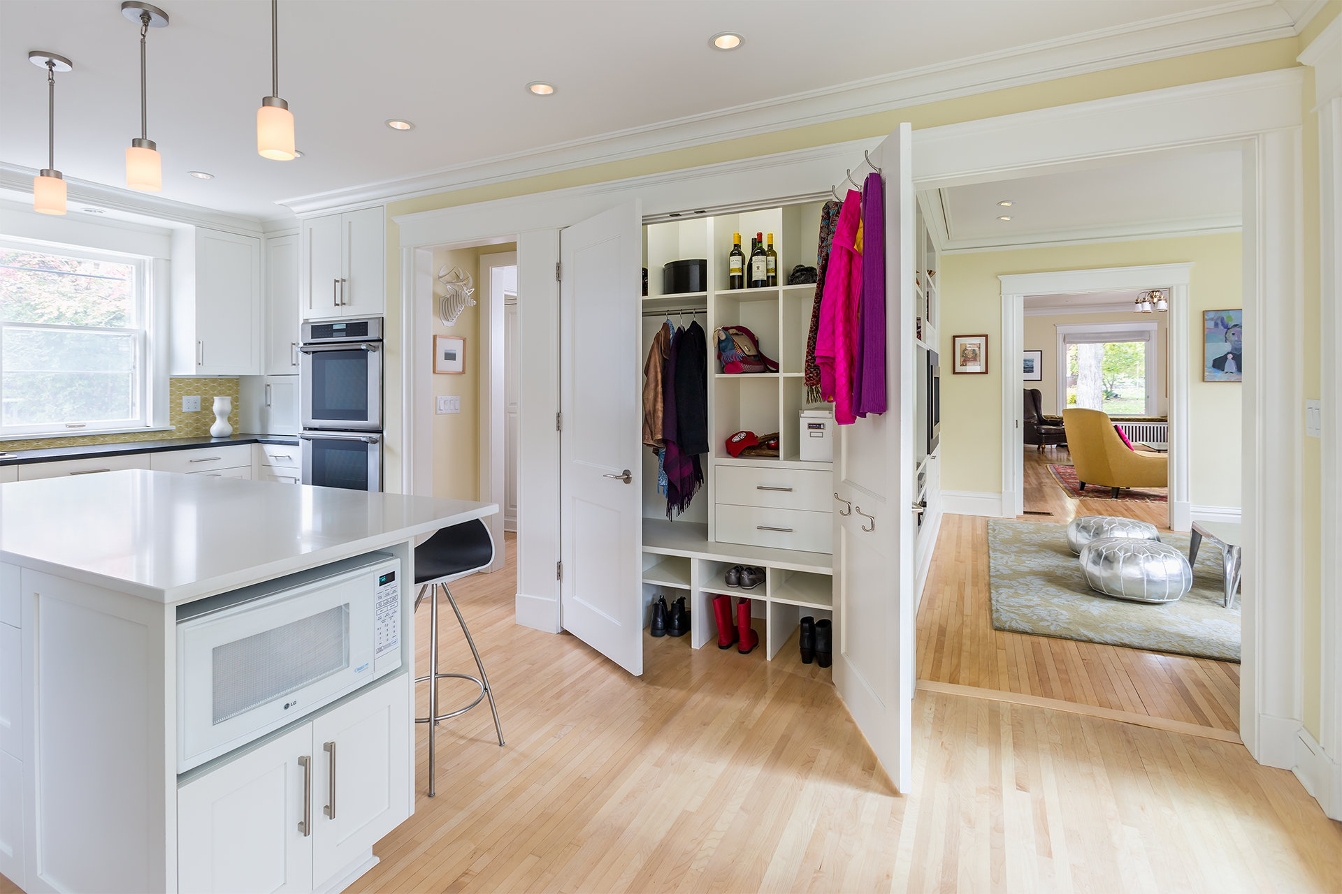 This charming and eclectic Kenwood residence was limited by a traditional layout common to homes of the early 20th century; a poorly laid out kitchen and family room, limited by an antiquated coal fireplace and service stair. Our team was engaged to bring a greater sense of order and flow to the home for an active family with three children. The U+B design removed the back stair and the fireplace to accommodate a new, functional and spacious kitchen complete with an internal dining niche. The family room and office area are now open to the kitchen creating a welcome and open social space for the family. Materials were selected to blend seamlessly with the older home while complementing the new open light-filled space.