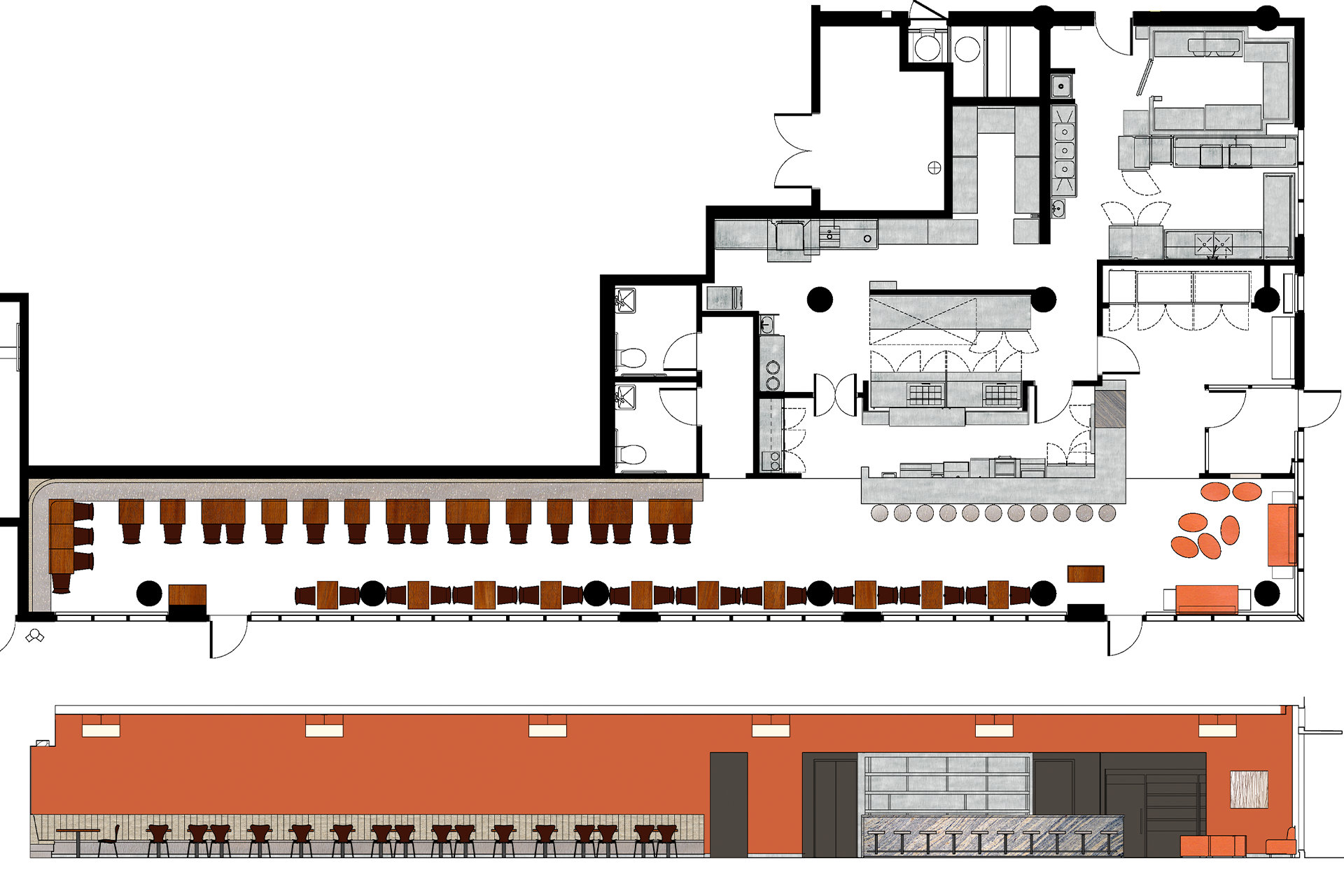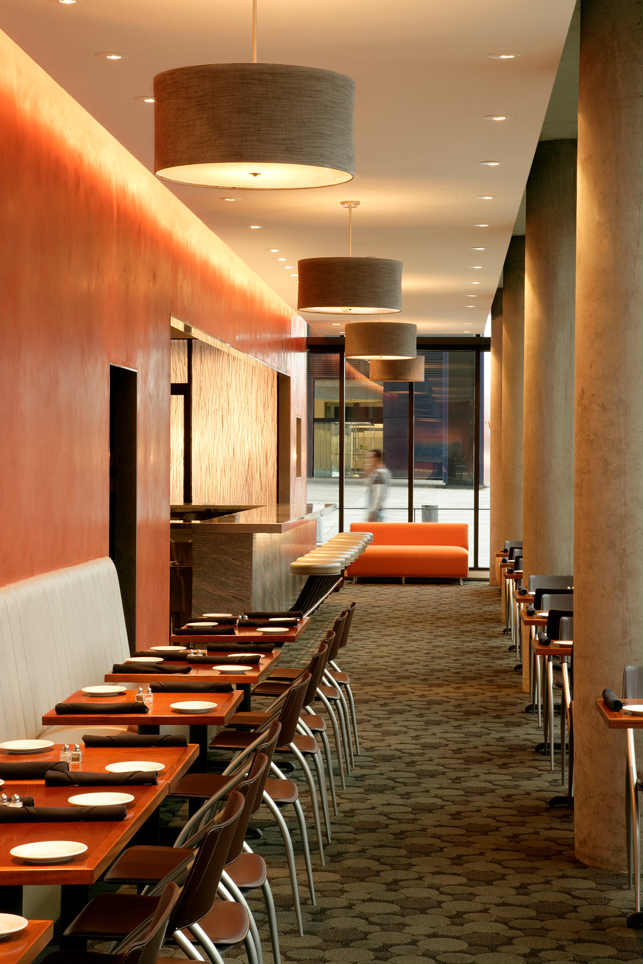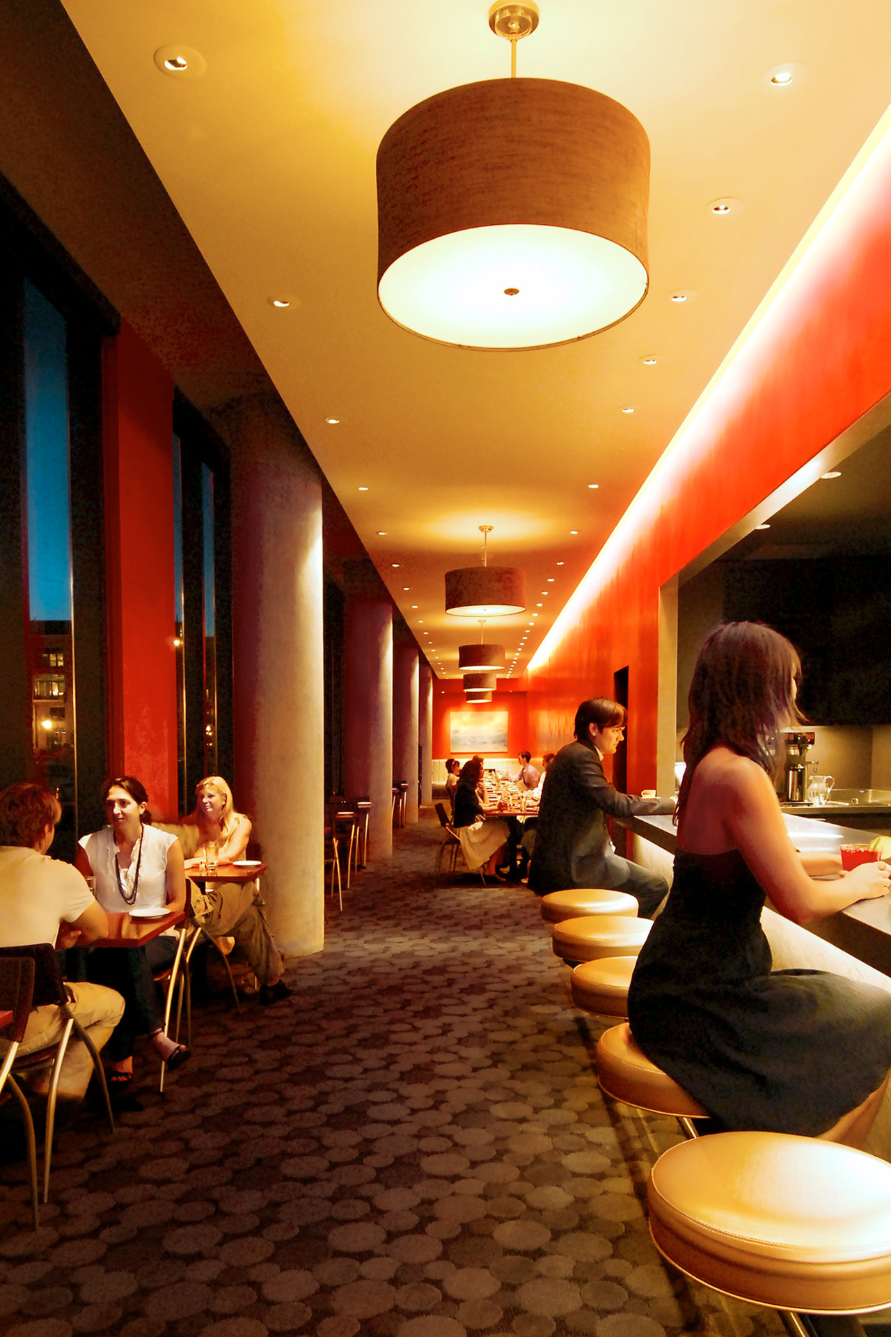 Designed for award winning chef, Brenda Langton, this space boasts an eleven-foot-wide by one-hundred-foot long seating corridor, the length of which is flanked with floor to ceiling glass on the west while the east wall is bathed in a poppy red Venetian plaster wall. A bar, fabricated from a rich slab of Brazilian granite, is backlit, exuding an intriguing and understated aura. Diners sit beneath of long row of drum pendants, glowing and supporting the continuum of calm ambience throughout the space.