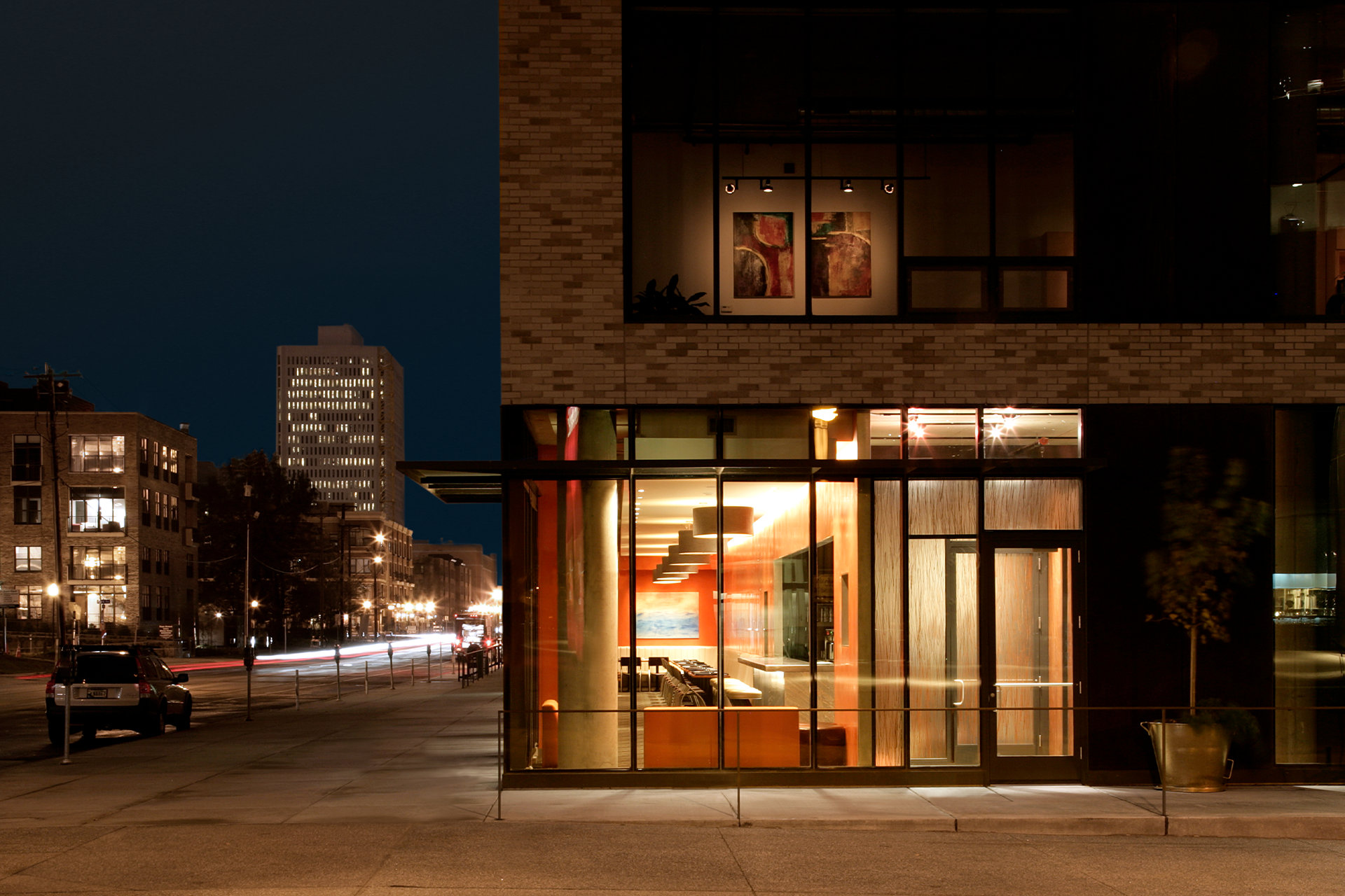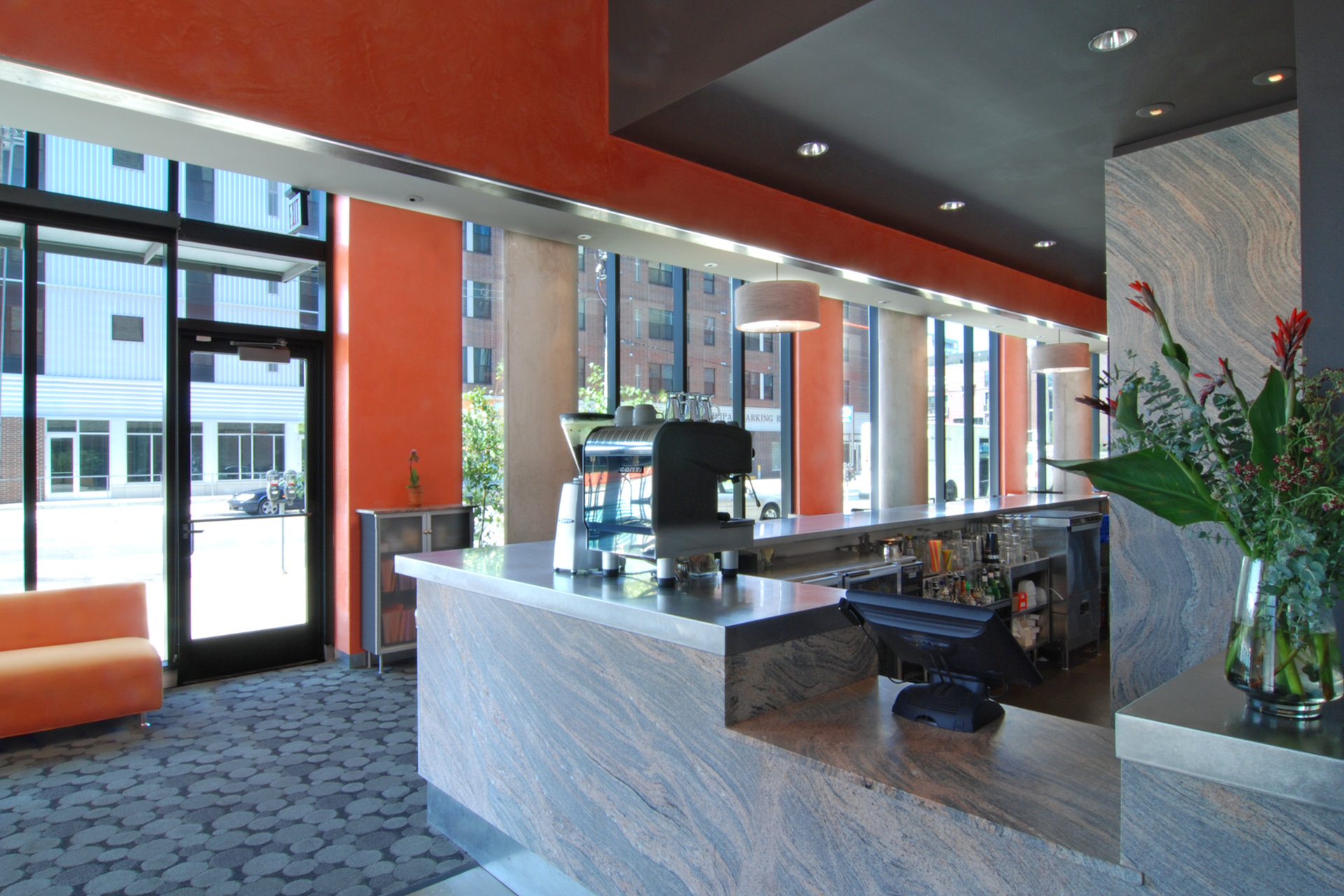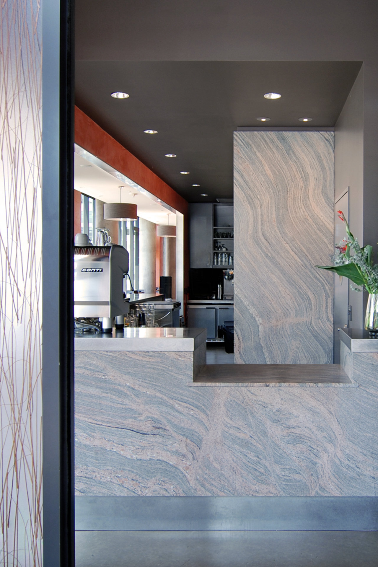 Designed for award winning chef, Brenda Langton, this space boasts an eleven-foot-wide by one-hundred-foot long seating corridor, the length of which is flanked with floor to ceiling glass on the west while the east wall is bathed in a poppy red Venetian plaster wall. A bar, fabricated from a rich slab of Brazilian granite, is backlit, exuding an intriguing and understated aura. Diners sit beneath of long row of drum pendants, glowing and supporting the continuum of calm ambience throughout the space.