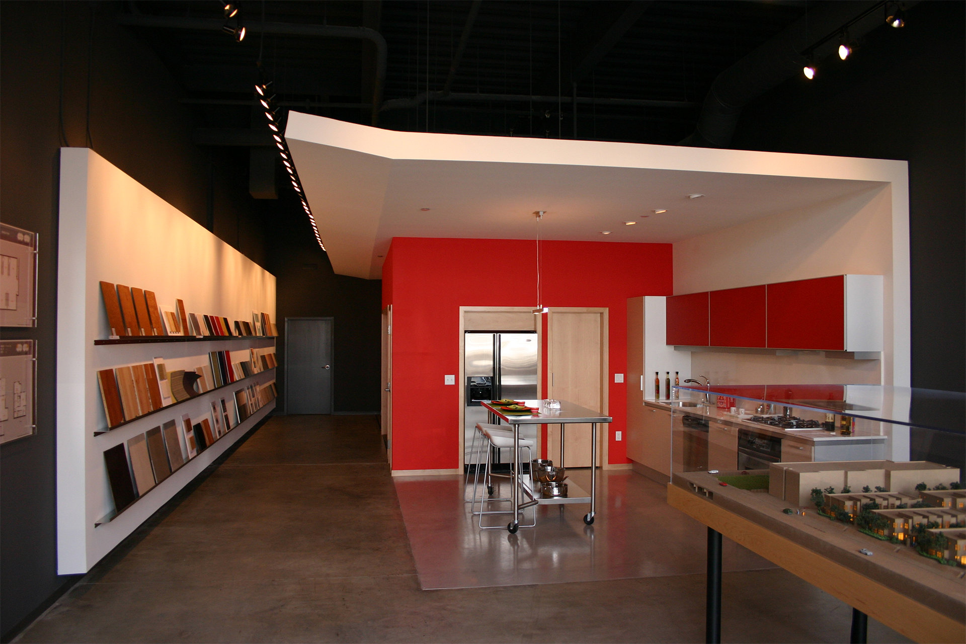 A sales center for a townhouse development in Uptown, Minneapolis, the project is both a showcase for the aesthetic vision of the development and an efficient setting for selling and personalizing the development’s townhouse units. A display wall for product samples provides buyers with easy visual and tactile access to material choices. www.track29uptown.com