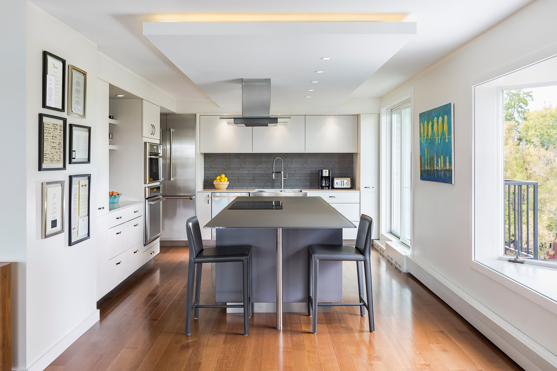 The owners of this existing condominium expressed a strong desire for a contemporary living space that could accommodate larger social gatherings and serve as a gallery for the owners’ collection of art and artifacts. The existing space, limited in ceiling height and day-lighting presented a multi-faceted design challenge.