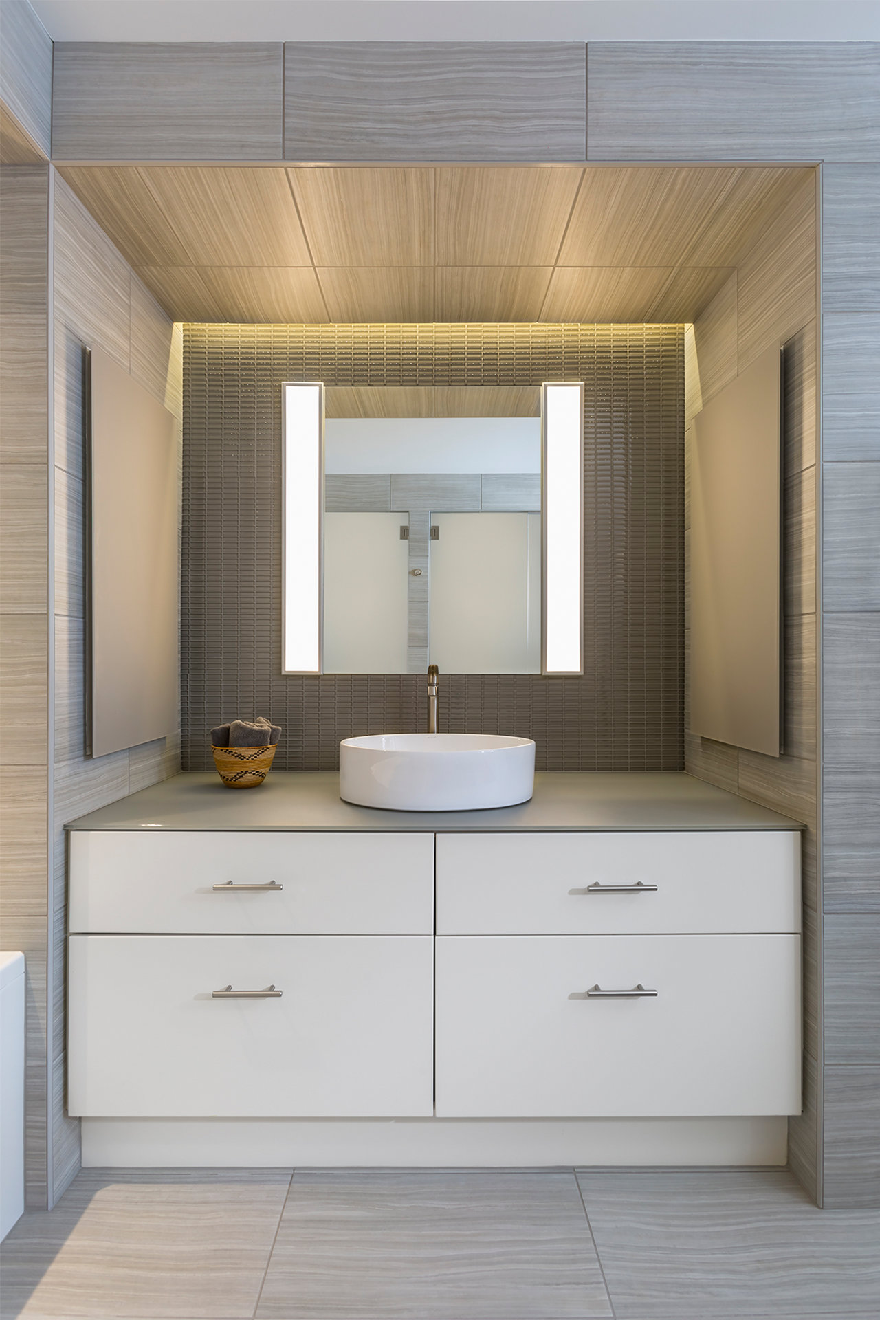 With the extraordinary views of Lake Calhoun and downtown Minneapolis as inspiration, the U+B team proposed a spatial reconfiguration of the master suite, opening the entire condominium up and allowing light to flood into the space. The revised layout presents a serene and free-flowing space, conducive to entertainment and a contemporary lifestyle of the owner. A well-curated palette of materials, including etched, back-painted glass and quartz countertops serves to carry light deeper into the space.